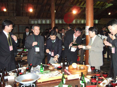 第24回プラズマ・核融合学会年会懇親会は平成19年11月28日に灘菊酒造・西蔵にて開催されました。現地実行委員会が全てを取り仕切るところだけに、姫路の特徴を出すべく灘菊酒造様との打合せを重ねました。また、年会会場のイーグレ姫路から懇親会会場までは貸切バス(神姫バス様)を3台準備しました(国内学会の懇親会でバスで会場へ移動というのは珍しいと思います)。参加者数は約120名であり、会場収容人数から考えて程よい人数だったと思います(料理も適量になりました)。料理は姫路の名物を中心に揃えていただき(下記写真参照)、酒蔵だけに日本酒を豊富にご提供できました。参加者の皆様にご好評いただけたようで、何よりです。