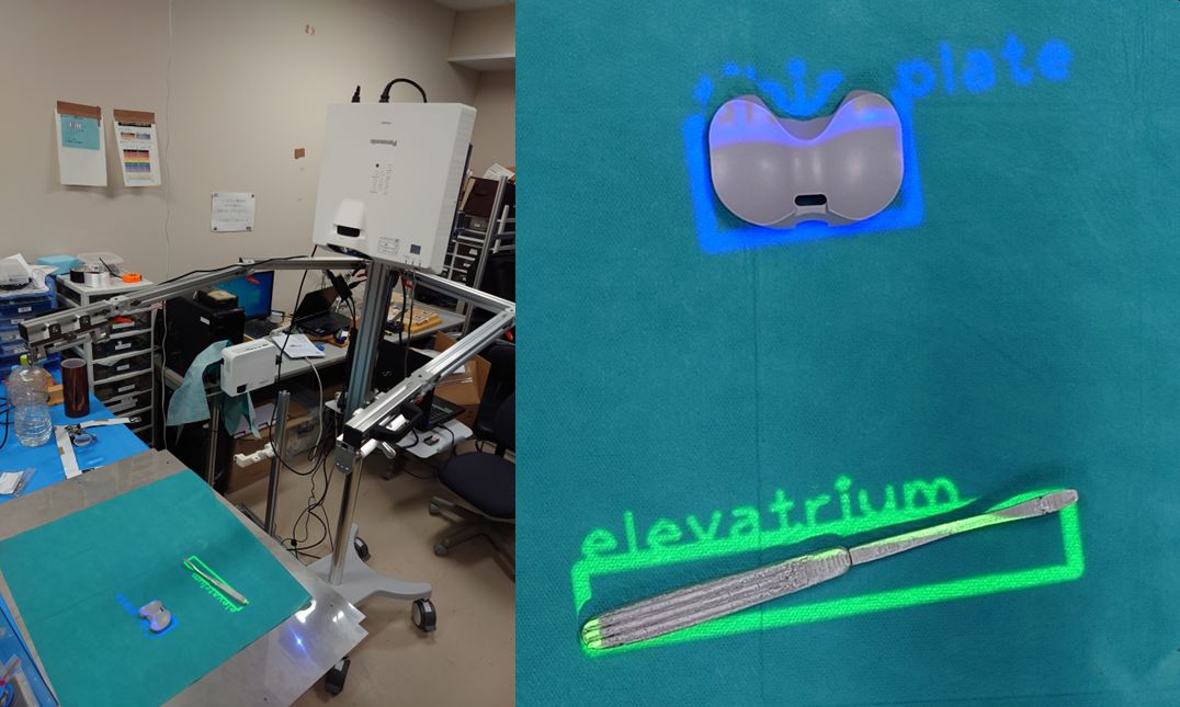 一例として手術場における器械の自動認識の開発を行います。カメラで撮影した画像内で物体を特定し、プロジェクションマッピングによって現実空間で強調表示します。手術場では多くの器械があり、それらを執刀医に手渡しする作業を「器械出し」と呼びます。器械出しの作業を支援することで、看護師の負担が軽減されます。