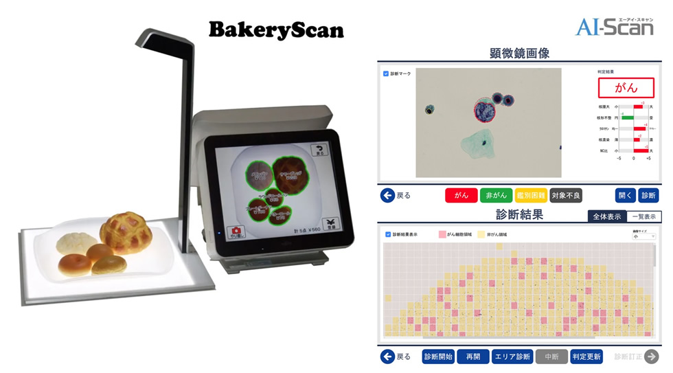 AI画像認識に関する様々な研究を行っています.世界初の画像認識レジシステム「BakeryScan」を開発し,全国のパン屋さんで使用していただいています.また,その応用展開として,細胞診断支援システムも開発しており,大量の細胞画像の中からガンの可能性がある細胞を見つけ出し,医師にその細胞の特徴とともに提示するシステムを開発しています.その他,様々な企業と共同で外観検査システムを開発しています.
