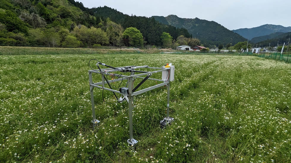カモミールの自動収穫ロボットを開発しています.GPS情報を用いた畑内の自律移動や,摘み頃の花を検出して位置を計測し,ロボットアームを制御してロボットハンドで摘み取る一連の機構を開発しています.カメラや様々なセンサの情報を統合して,キャタピラやロボットアームを自律制御することで,農作業の負担軽減に取り組んでいます.