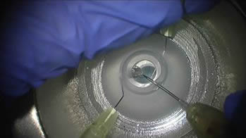 AI技術を基礎として、眼科手術をサポートするシステムを開発します。眼内レンズ強膜内固定術とは白内障手術の最新の術式の1つです。ただし、施術数が少なく、その教育システムが強く求められています。そこで、教育システム開発の一環として、深層学習に基づくリアルタイム手術器具追跡の方法を開発します。一般に、眼科医は執刀時、自身の頭部に付けたカメラで手術患部を録画しています。まず、録画された手術動画を対象とし、次にリアルタイム追跡に移行させます。システム開発には模擬眼に対する手術動画を用います。図は手術中の1フレームです。