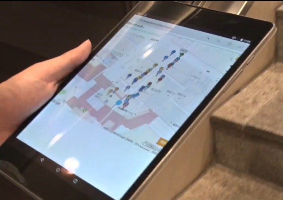 GPSの届かない地下商店街などでも,既に設置されているWi-Fiの電波を利用して,スマホ上の地図に利用者の位置と地域情報を示すシステムを開発しています。スマートフォン用のアプリとサーバーの情報により,利用者の利便性と商店街,地域の活性化を結びつけます。