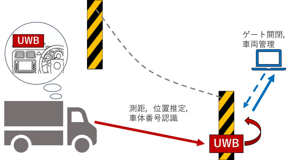 電波を発信する自動車など移動体を識別し,その距離,向き,速度などを測定するため,UWB(Ultra Wide Band)システムを始めとした様々なセンシング結果をワイヤレスで繋いで利用する。識別・測定結果は自動車を対象に一例として,ゲートの開閉や駐車場の案内などへの適用を目指す。