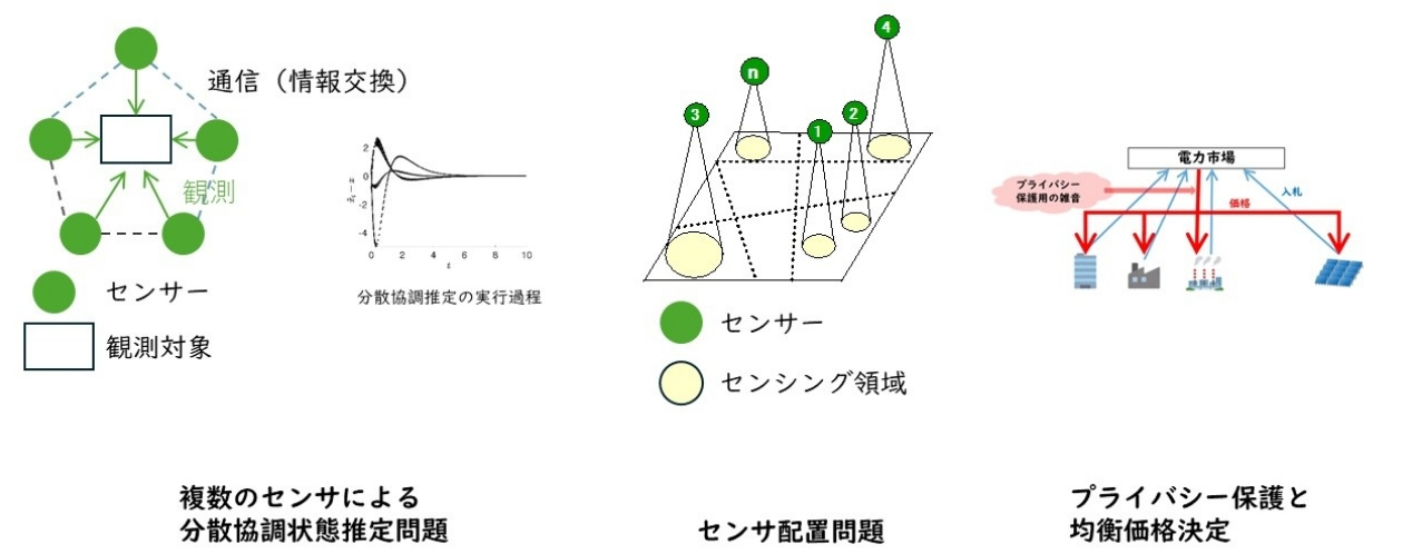 多数の自律したエージェントが存在する状況下での制御問題を研究しています。多数のエージェントは互いに干渉し合うため、どのように協力すれば、状態推定など大きなタスクを実行可能か、また協力して広大な領域をセンシングさせるためには個々のエージェントにどのような評価関数を設計すれば良いかであったり,そのような中で機微な情報を守るにはどうすればよいかを考えています。様々なものがネットワークに接続され、情報交換を通じて個々の能力以上のものを発揮しており、そのような社会をより発展させることに貢献できます。