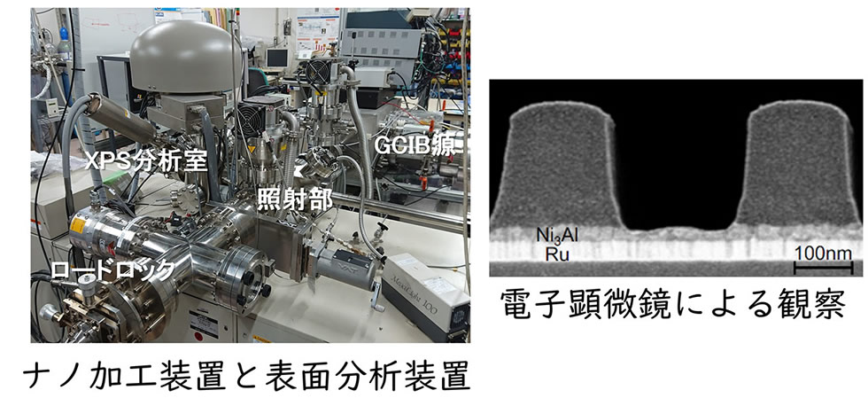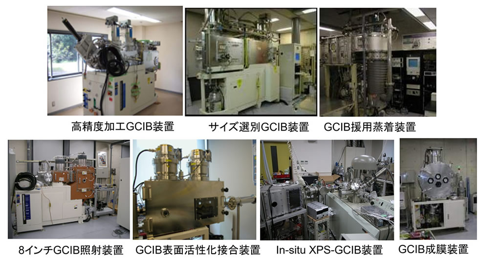 数千個のガスが塊となったクラスターを用いた新たなナノ構造形成方法を開発しています。そのためには、クラスターを衝突させたときに、どのようなことが起こっているかを原子レベルで解明することが必要です。そのため、ナノ加工装置と表面分析装置を結合し、表面状態をX線を用いて観測しています。解析に必要な表面物性や反応の知