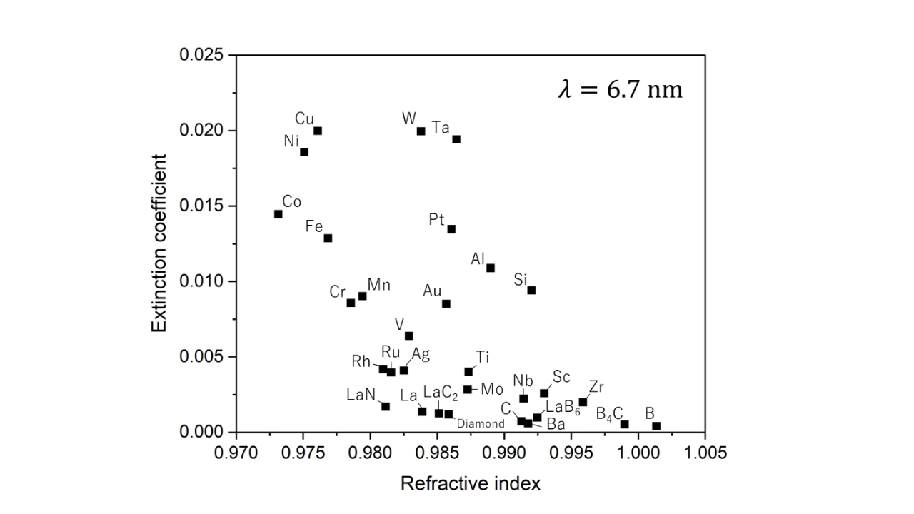 現在の最先端半導体デバイス製造ではEUV(13.5nmの軟X線)が利用されていますが、更なる微細化に向けてBeyond EUV(BEUV, ~6.7nm)が提案されています。BEUV露光技術の確立に向け、BEUVミラーやフォトマスク(回路を転写するための原版)を構成する多層膜設計、対応する露光方式を研究しています。課題であるBEUV反射率の向上、光散乱の低減などの物理的課題を解決し、BEUV露光を世界に先駆けて実現することを目指しています。