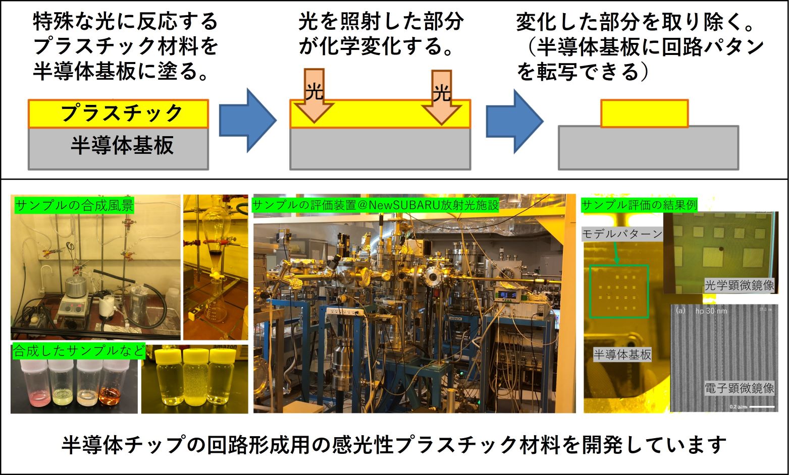 スマホやパソコンの頭脳にあたる半導体チップには、無数の回路が形成されています。この回路パターンを作るのに、特殊な光をあてると化学変化する、感光性のプラスチックが使われています。実は、このプラスチックの性能が良くなると、スマホやパソコンの性能が良くなるだけでなく、値段も安くなります。そんなわけで、新しい感光性プラスチックを作っては評価して、より良い材料を世に出そうと奮闘しています。