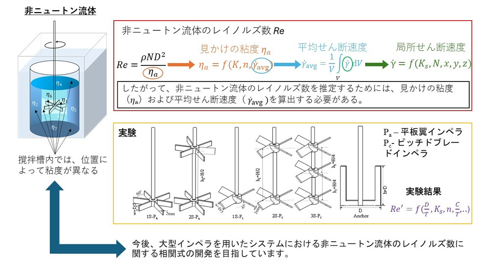 私の研究では、パドルインペラ、ピッチドブレードインペラ、アンカーインペラを含むさまざまなインペラ形状を用いた実験結果に基づき、非ニュートン流体のレイノルズ数を算出する式を提案しました。産業界では大型インペラが必要とされるため、今後は高粘度流体にそのようなインペラを用いた実験も行いたいと思っている。また、伊藤教授が提案する、AIを活用した非ニュートン流体の粘度を容易に測定できるシステムの開発にも参画したいと考えている。