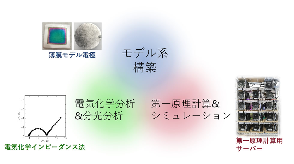 二次電池の内部でどのような電気化学反応が起こっているかを理解することは、電池を設計する上で重要な指針になります。この研究では二次電池の中の観察対象とする反応を調べやすいように測定系を工夫し、それに対して様々な実験的解析手法を適用することで、二次電池の内部で起こる様々な反応を詳細に明らかにします。また理論計算による解析を組み合わせることで、より多角的に反応の解析を行います。