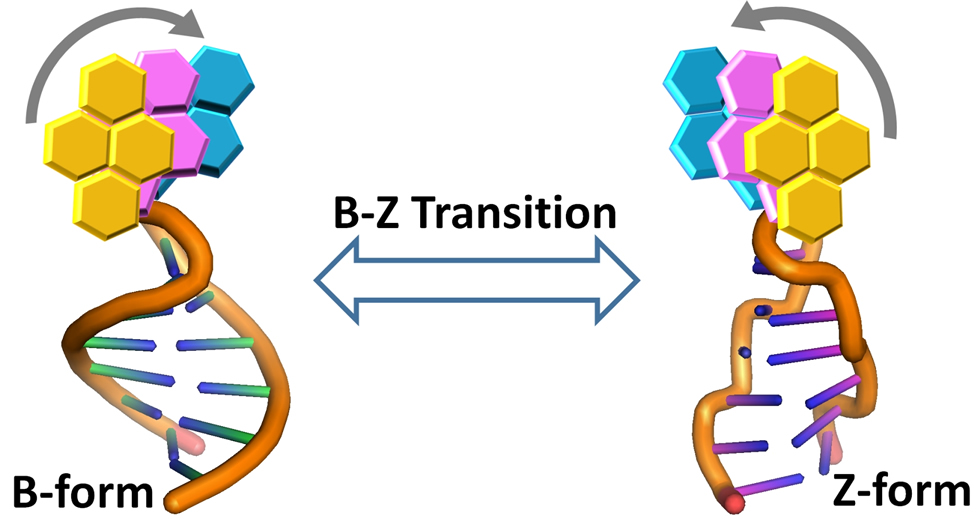 蛍光性分子を連結した短鎖のDNAを使って、生体内の多様な機能または作用がどこで起こっているのかを蛍光で判別する研究を行っています。キラリティーは自然界における根本的な特徴の一つであり、生命活動の解明や機能性材料開発の上で重要な要素でもあります。ここではDNAのらせん構造上に蛍光性分子を並べて超分子キラリティーを発現させて、機能または作用で引き起こされる超分子キラリティーのスイッチングに対応した蛍光出力の実現を目指しています。これによって生体のどこで機能または作用が起こっているのかを判別することが可能になります。