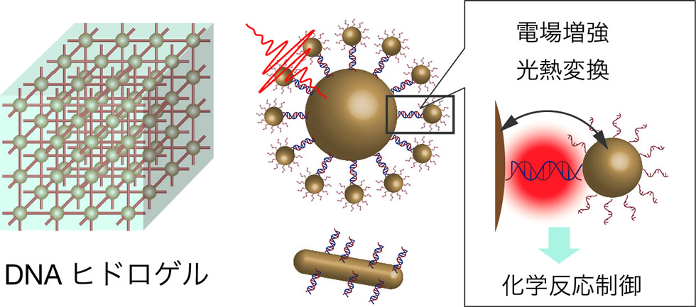 DNAの自己組織化を利用し、金ナノ粒子の光熱変換や電磁場増強の特性を活用することで、物質変換や物質放出の機能を持つバイオマテリアルを作製しています。