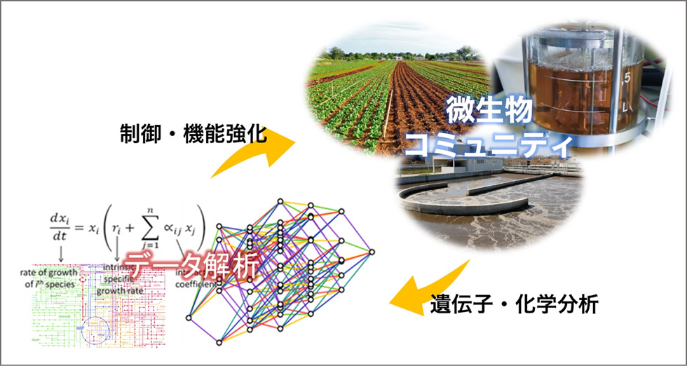 微生物は様々な種が寄り集まった集団(コミュニティ)として生活しており、その機能は農業や食品製造、排水処理といった幅広い産業で活用されています。本研究では、生態学・分析化学・情報学といった様々なアプローチを駆使して、1つ1つの微生物種が個性が、どのようにコミュニティ全体の性質を決定しているかを解析しています。複雑な微生物コミュニティの動態を理解し、その機能の設計・制御を可能とすることで、様々なバイオテクノロジーの発展に貢献することができます。