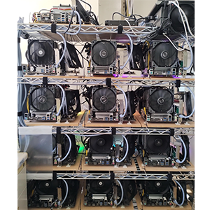 計算を回すと排熱がすごいので、冬場は暖房代わりにもなり一石二鳥です。また市販のLEDイルミネーション付きマザーボードを流用しているので、夜間には沢山のマザーボードの光が煌めいて幻想的です(写真1 & 写真2)。