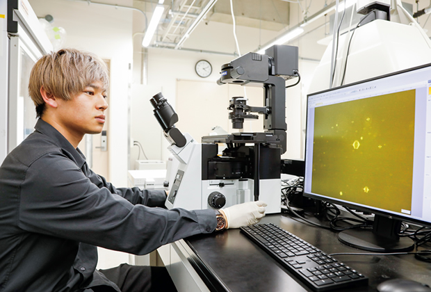持続可能で人々が健康に過ごせる豊かな社会をを築くためには、再生可能エネルギーの活用や、医療・情報社会を支える新しい材料の開発が欠かせません。化学コースでは、基礎科目から合成化学や化学反応プロセスといった専門科目を幅広く修得。基礎理論から生産プロセスまでを網羅的に学び、産業界をリードできる“化学のプロフェッショナル”を育成します。