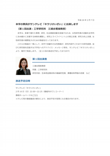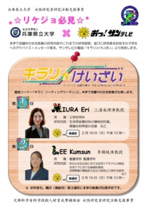- 2月16日に放送されたサンテレビ「キラリ☆けいざい」内の本学の女性教員紹介コーナー「キラリ リーディングウーマン」の映像がyoutubeにアップロードされました.