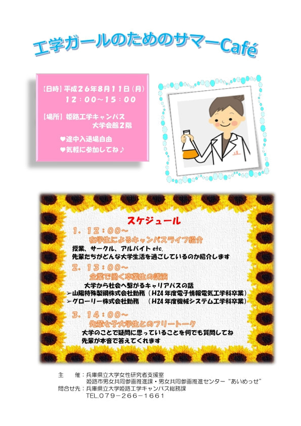 【特別企画】工学ガールのためのサマーCafé(主催:兵庫県立大学男女共同参画推進室,協賛:姫路工業倶楽部)開催日 令和4年8月11日(木) 14:00〜在学生によるキャンパスライフ紹介&企業で活躍する卒業生の講演 |