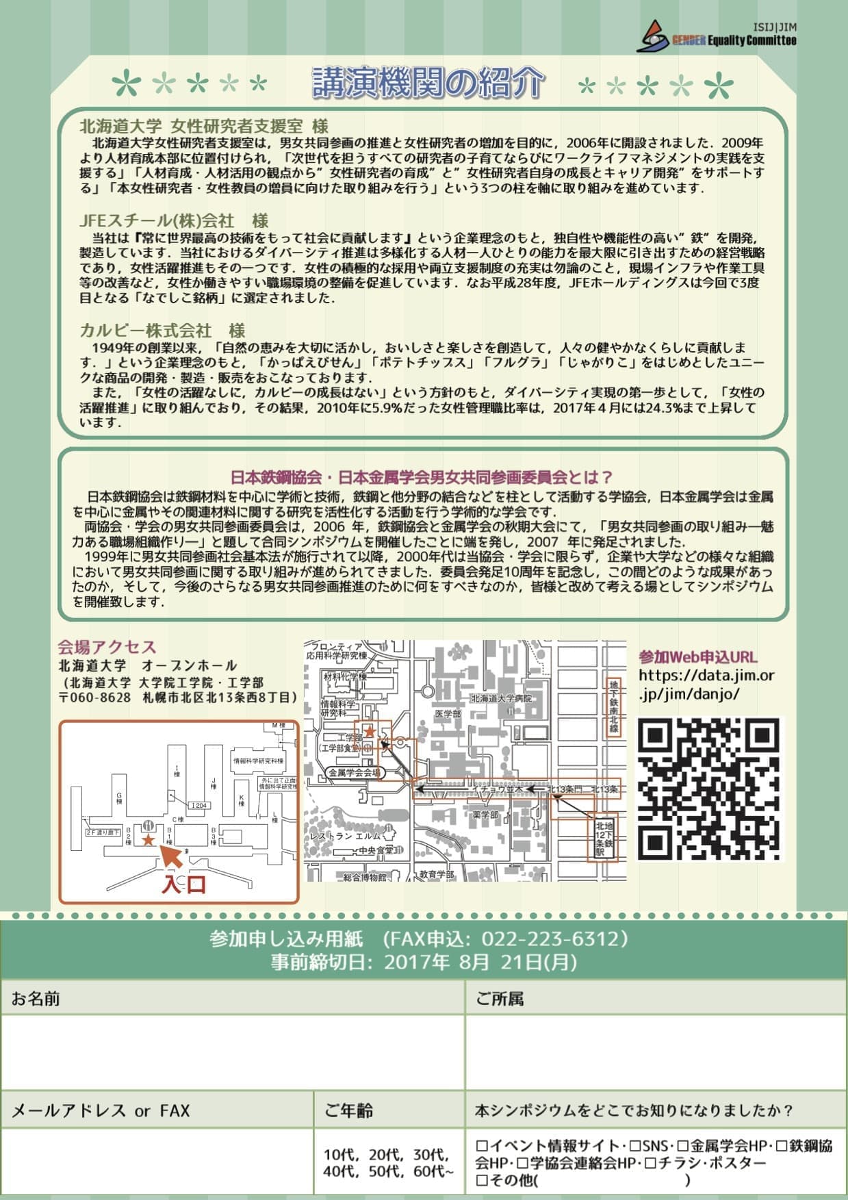 - 件名に「3月9日シンポジウム申し込み」と記載し,参加者全員の氏名ならびに団体名,代表者のご連絡先TELをご記入の上,上記メールアドレスまたはFAXにてお申し込み下さい.