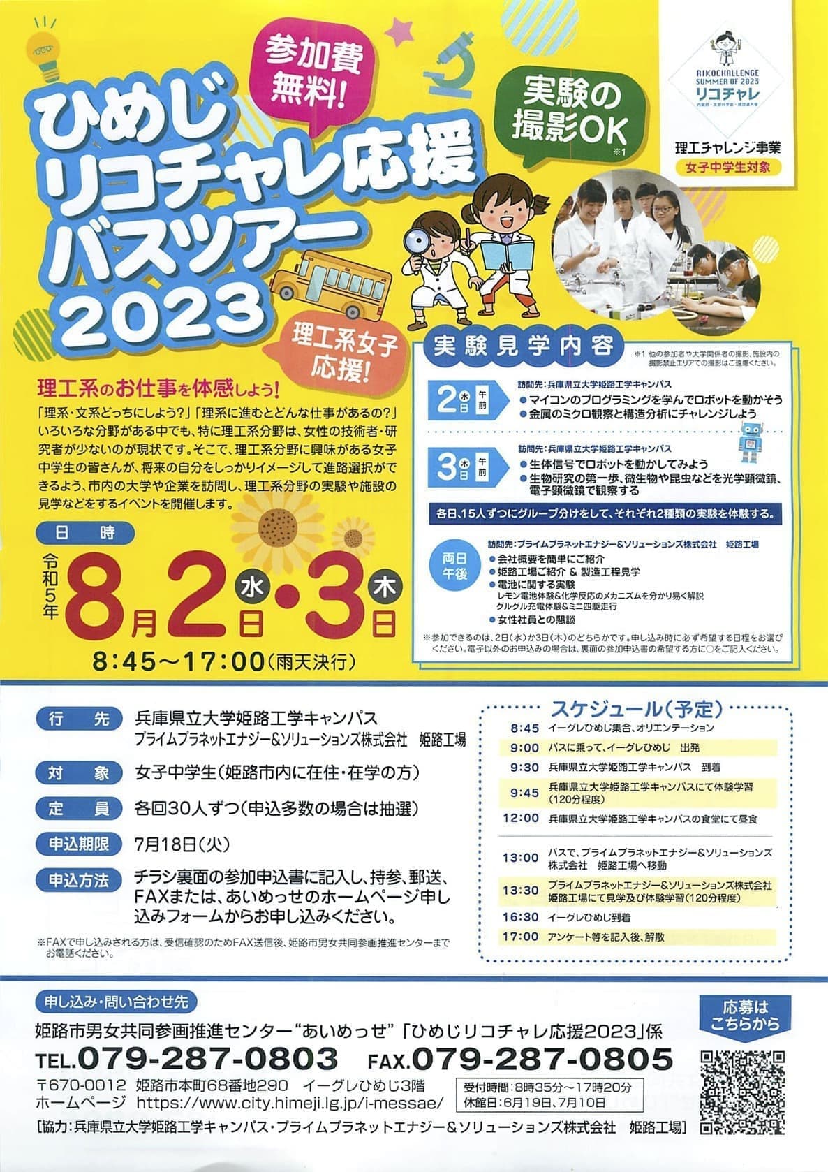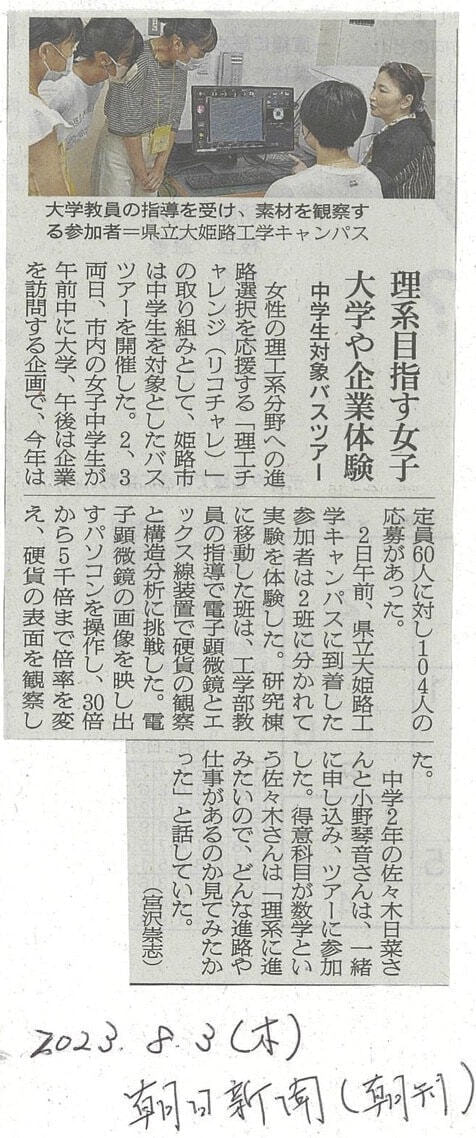 ひめじリコチャレ応援バスツアー2023に協力しました.地域の女子中学生向けイベント.本学の機械,応化,情報,材料の教員が講師を務めました. |