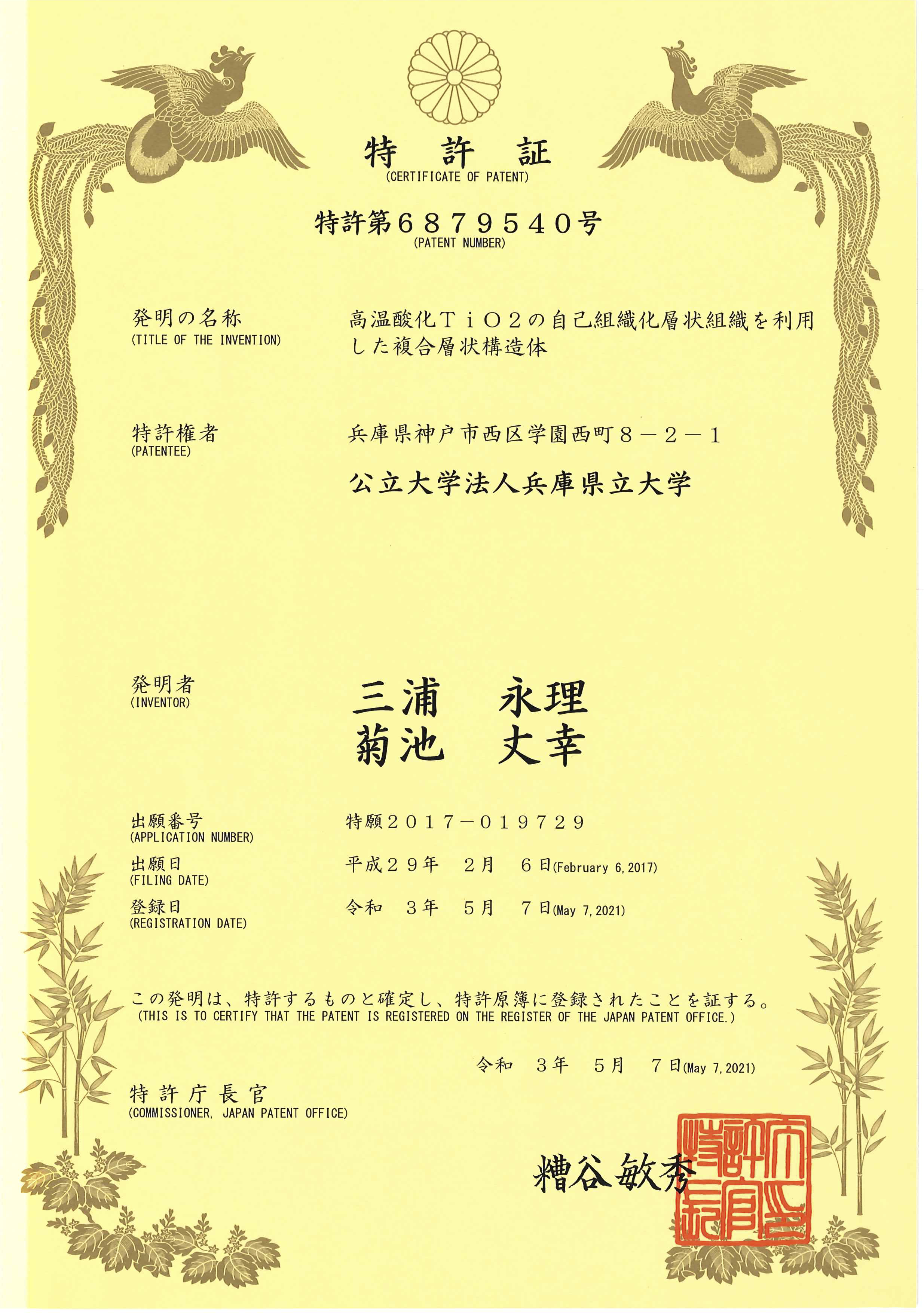 - ・高温酸化TiO2の自己組織化層状組織を利用した複合層状構造体;三浦永理,菊池丈幸,出願人;兵庫県立大学,出願日:2016年2月8日,出願番号:2016-22147.
