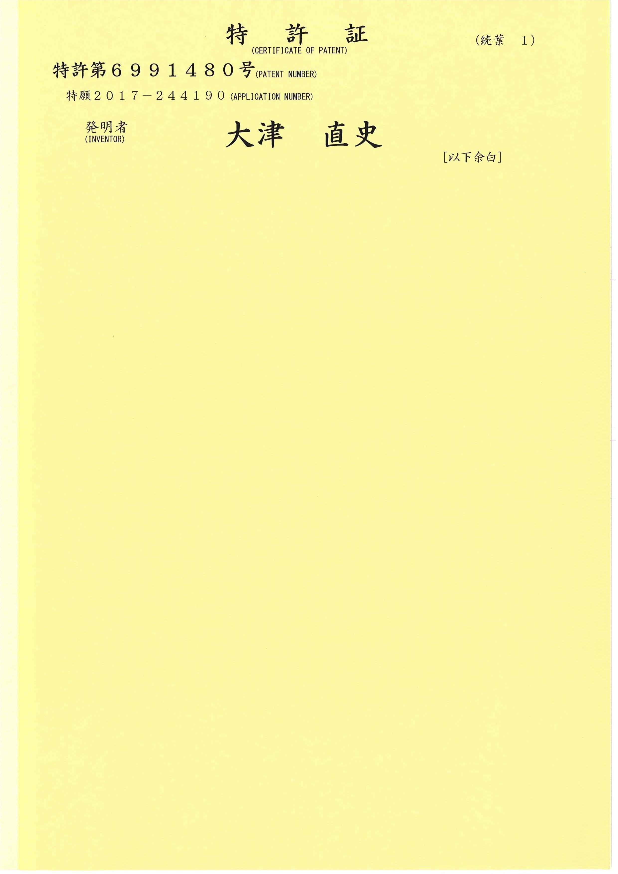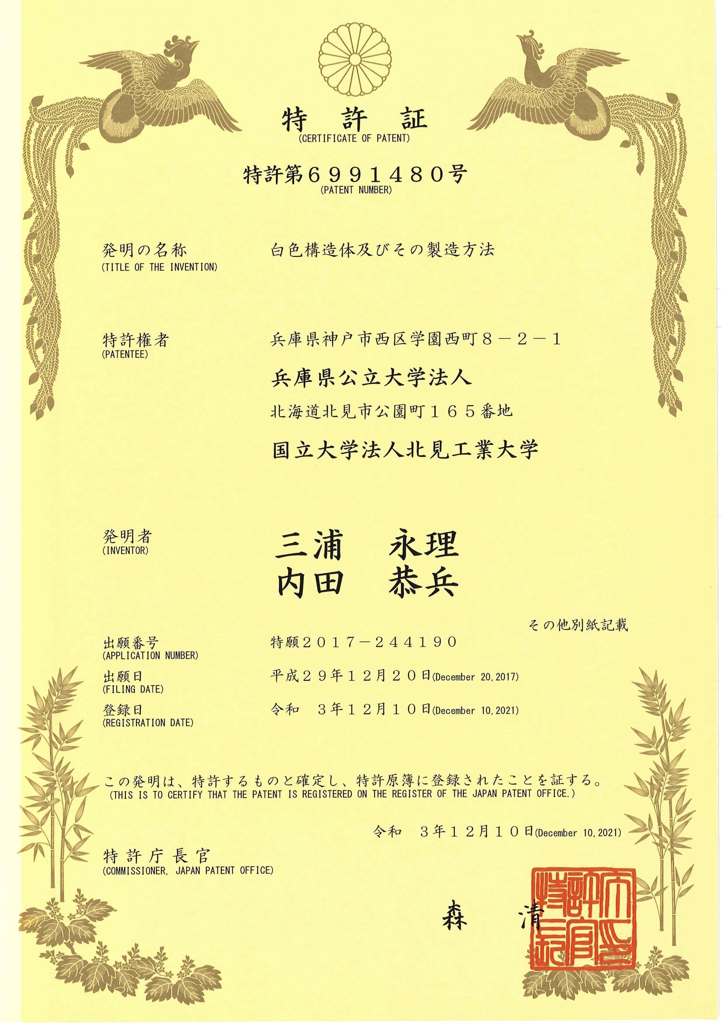 - 白色構造体及びその製造方法:三浦永理 ,内田恭兵,大津直史,出願人:兵庫県立大学,北見工業大学 , 出願日:2017年12月20日,出願番号: 2017-244190. 特許 登録番号:第 6991480 号 (登録日: 2021 年 12 月 10 日)
